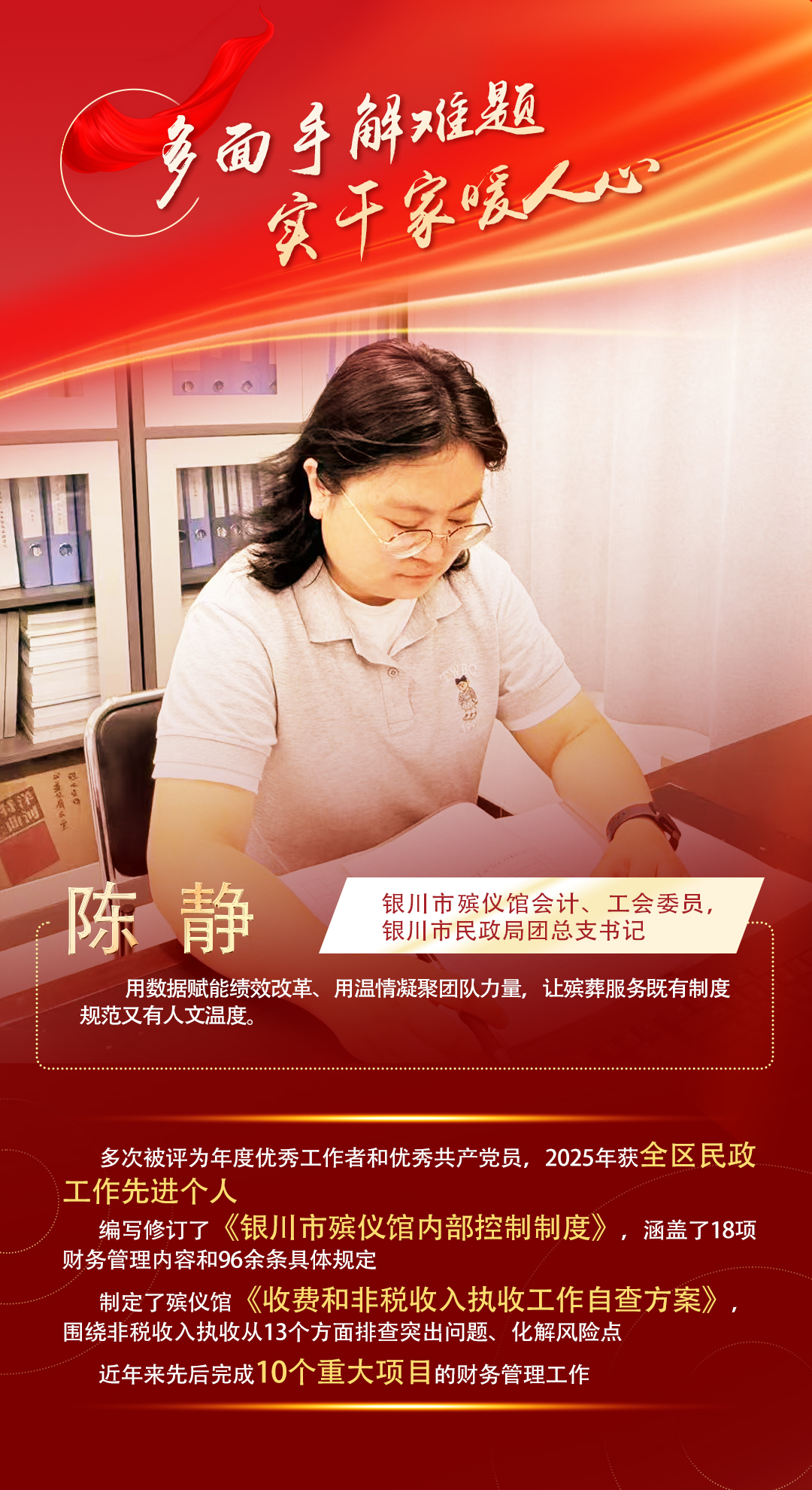 作为银川市殡仪馆会计、工会委员兼银川市民政局团总支书记,陈静在民生保障工作中发挥着多重作用。她充分发挥专业优势,构建殡仪馆财务内控体系,创新性地将财政管理要求与殡仪馆业务实际相结合,牵头编制了《银川市殡仪馆内部控制制度》,规范了18项财务内容和96余条规定,形成相关理论成果。她制定《收费和非税收入执收工作自查方案》,建立“风险排查+系统监管”机制,通过财政一体化系统和智能殡葬管理系统动态监控非税收入;创新实施采购资金全流程闭环管理,从预算到付款严格管控。这些举措提升了财务管理水平,保障了惠民政策落实,为殡仪服务提质增效提供了专业化的财务保障。